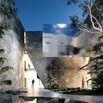 Beyond stones and open spaces, the next subsystem of MONOLYT’s architecture explores the rock as a treasure—a concept evoking discovery and preciousness. This principle is analogous to pyrite, a rock that, when stripped, reveals a cuboid formation with unexpected brilliance, comparable to the hidden richness in the project. Within the erosive process, these architectural elements function as blocks that settle and inhabit the carved spaces, defining everything from the access gatehouse to the equipment composing the common areas, with programs such as a spa, gym, and club.